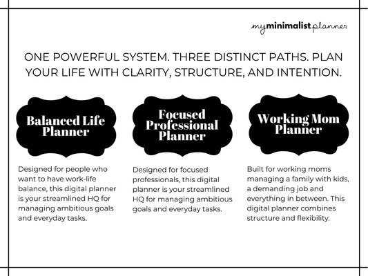 My Minimalist Planner's digital planners offer a sleek, paperless solution for staying organized and creative. Our minimalist collection combines functionality and aesthetics flawlessly, ensuring that your planning and creative endeavors are both efficient and stylish. Whether you're a busy professional or a diligent student, our planners will help you streamline your tasks and inspire your work. Elevate your productivity and creativity today with our premium collection.