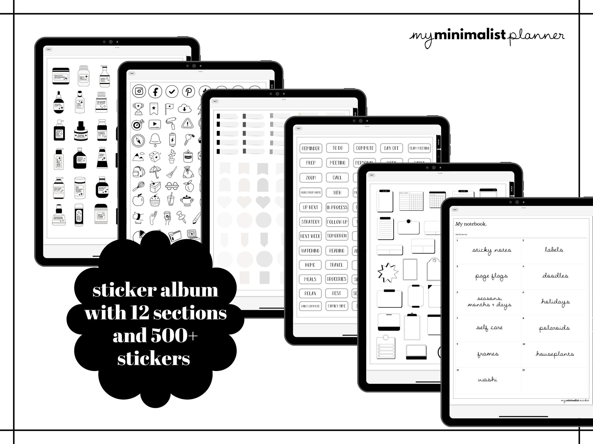 2025 Minimalist Digital iPad Planner, Sync with Apple + Google Calendar, Standard Black & White, Monthly Weekly Daily Template, Sticker Book