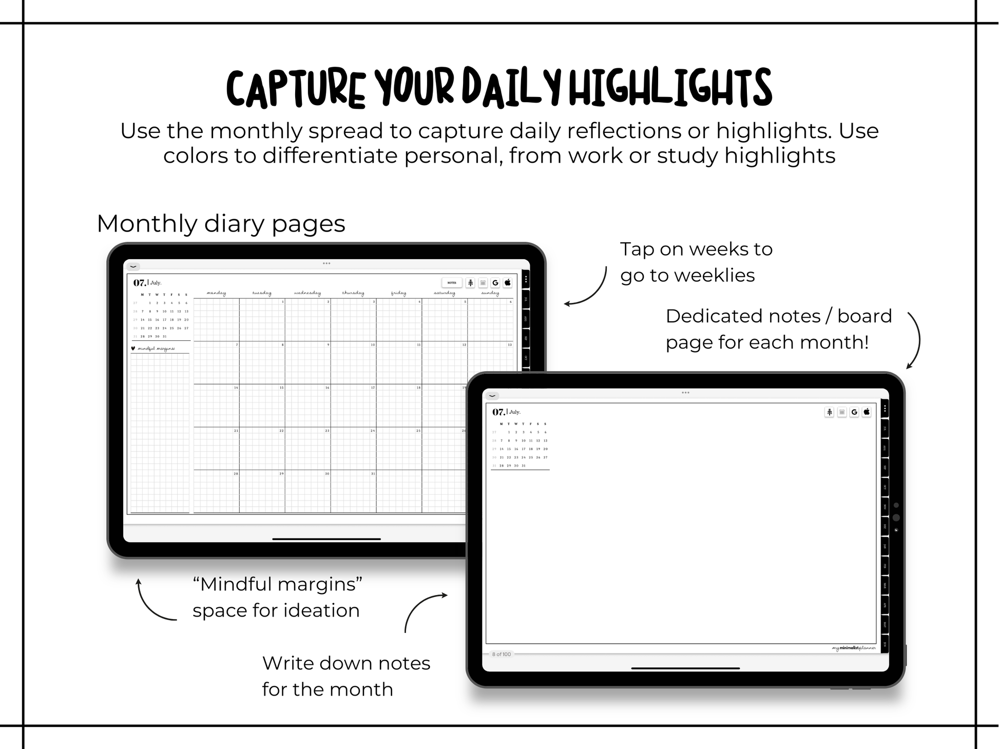 Get ready to completely revolutionize your journaling game with our highly customizable 2026 Digital Diary. With fully dated yearly, monthly and weekly pages, notes/vision board pages and 12 notebook sections, this is the only tool you need to get digitally inspired in an elegant and minimalist way.