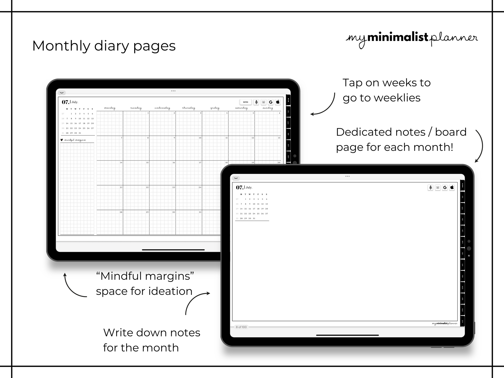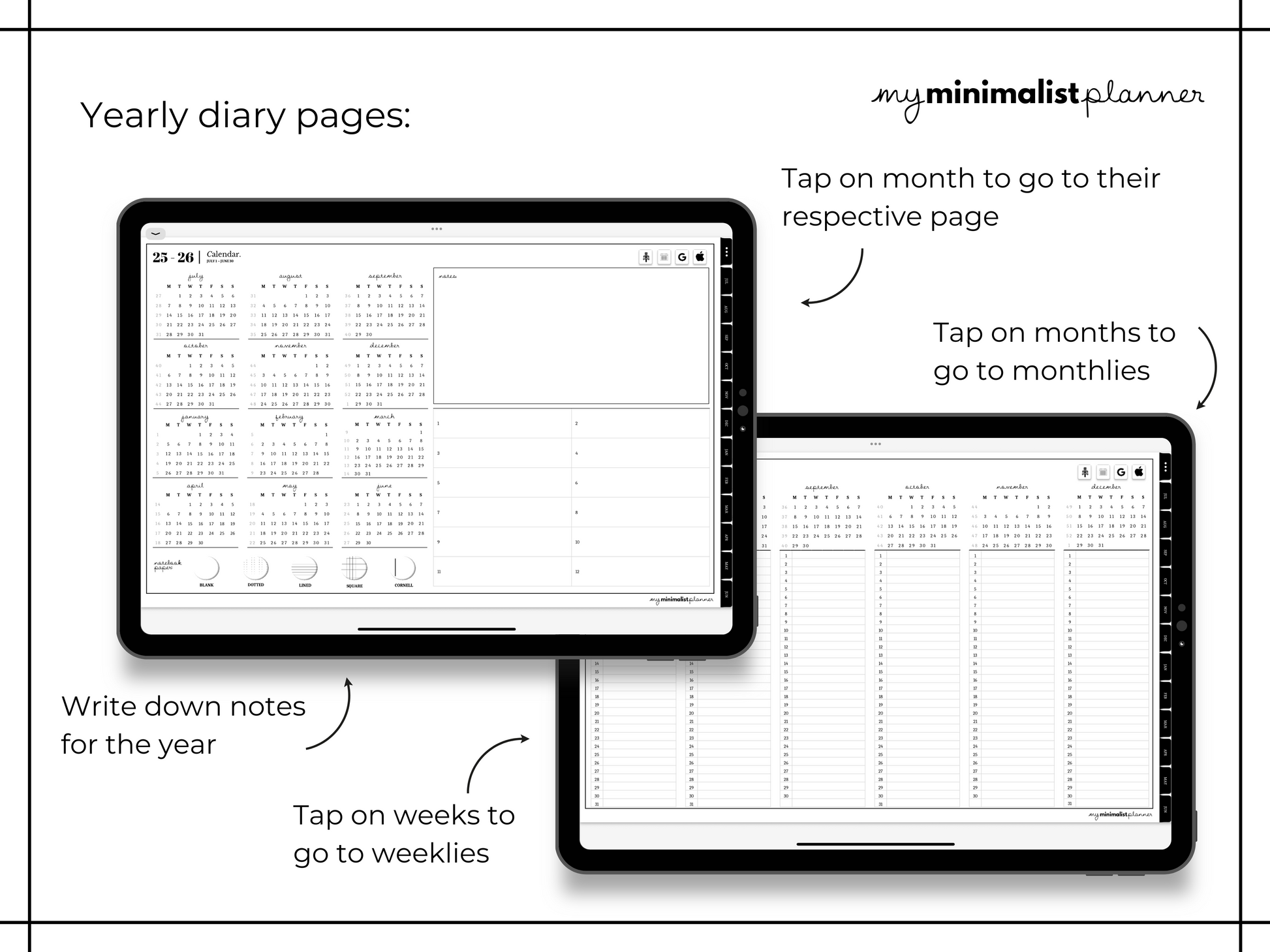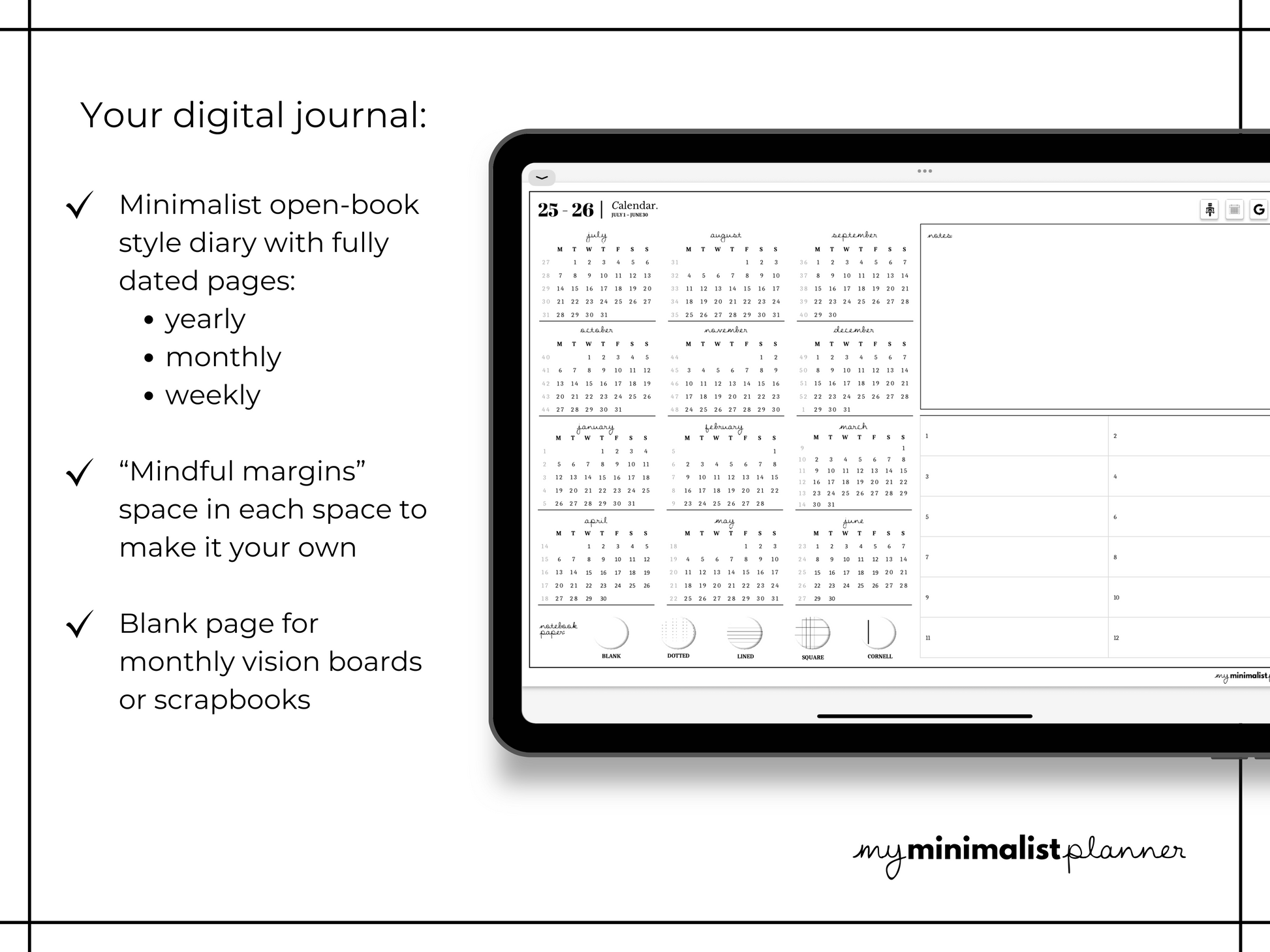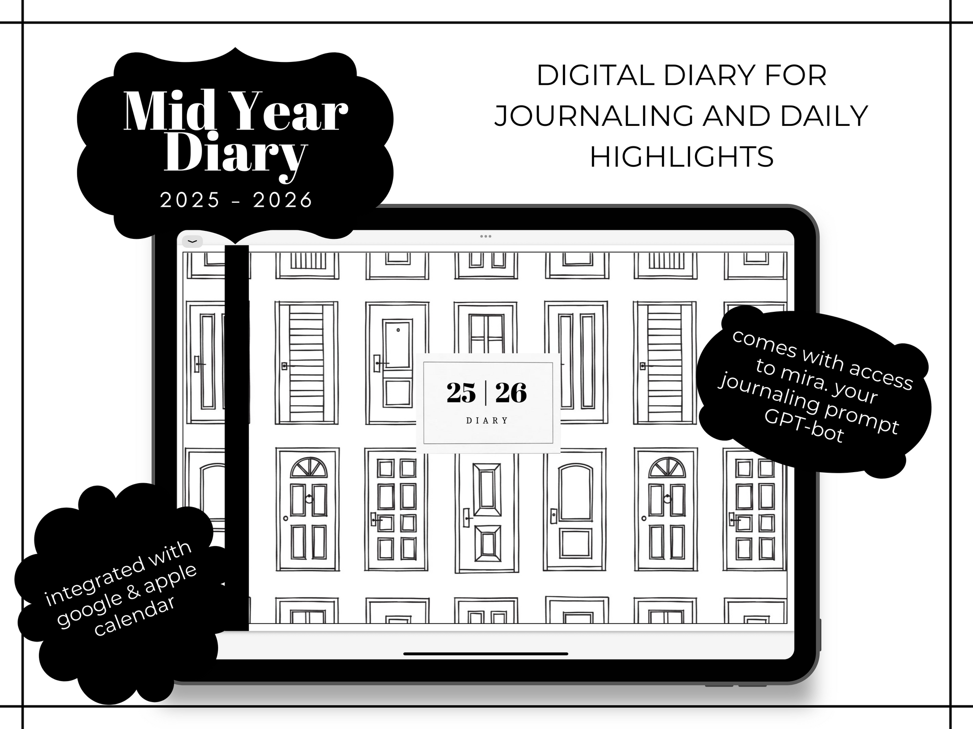 Get ready to completely revolutionize your journaling game with our highly customizable 2025-2026 Digital Diary. With fully dated yearly, monthly and weekly pages, notes/vision board pages and 12 notebook sections, this is the only tool you need to get digitally inspired in an elegant and minimalist way.