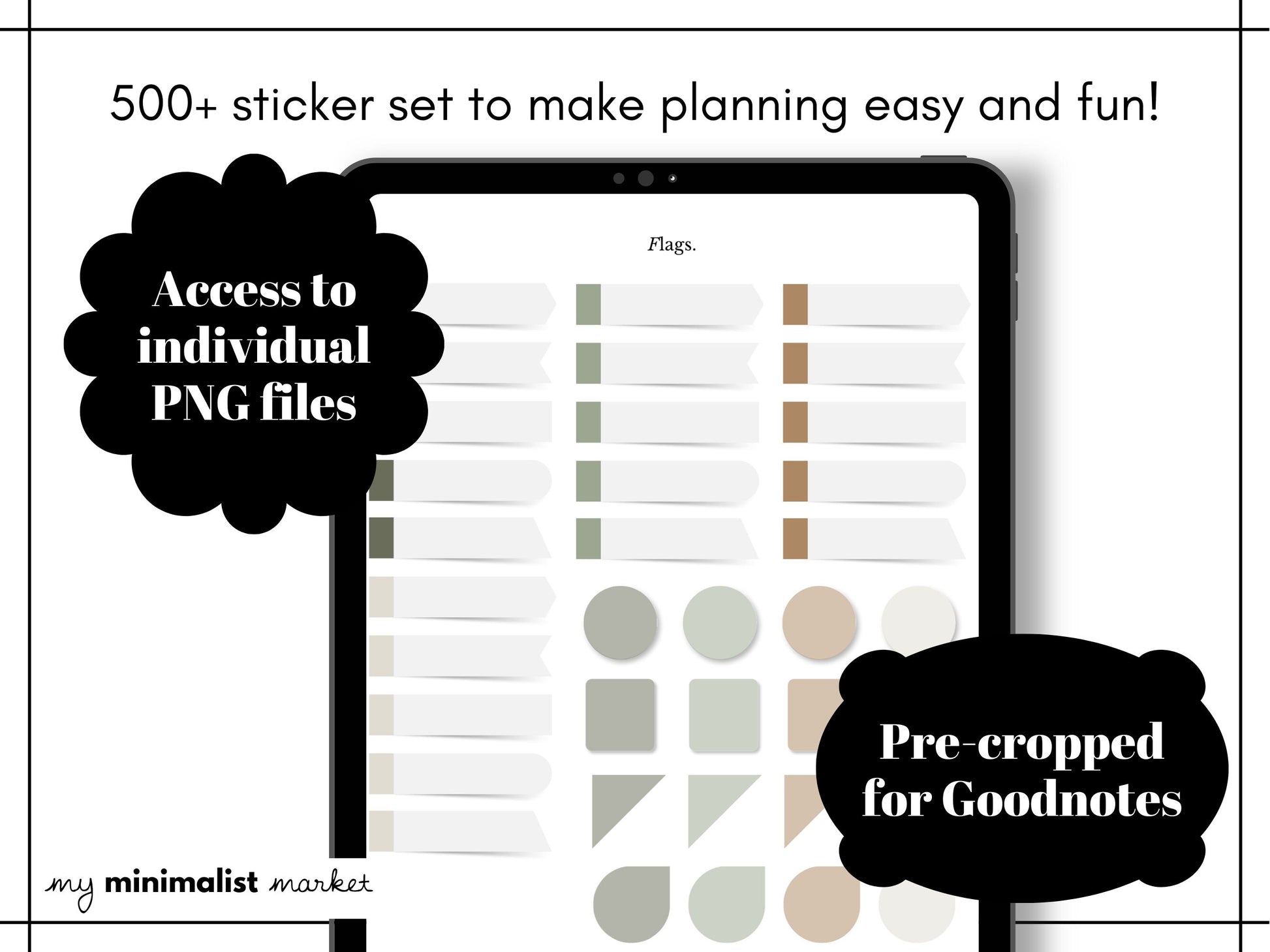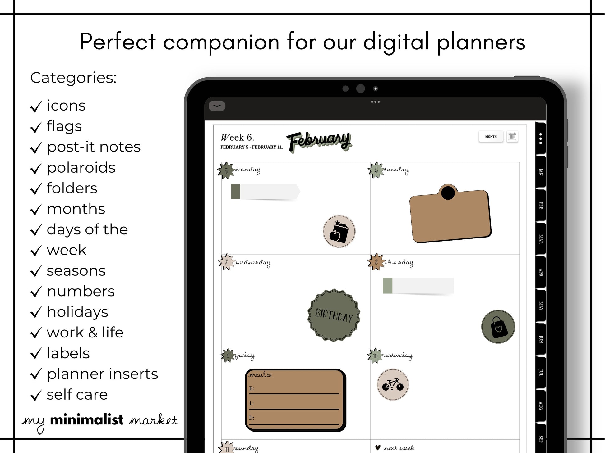 The digital sticker set comes with 500+ illustrations. Download the digital stickers for ready-to-use pre-cropped elements in PNG clipart form to use with you preferred digital planning app. Categories include: