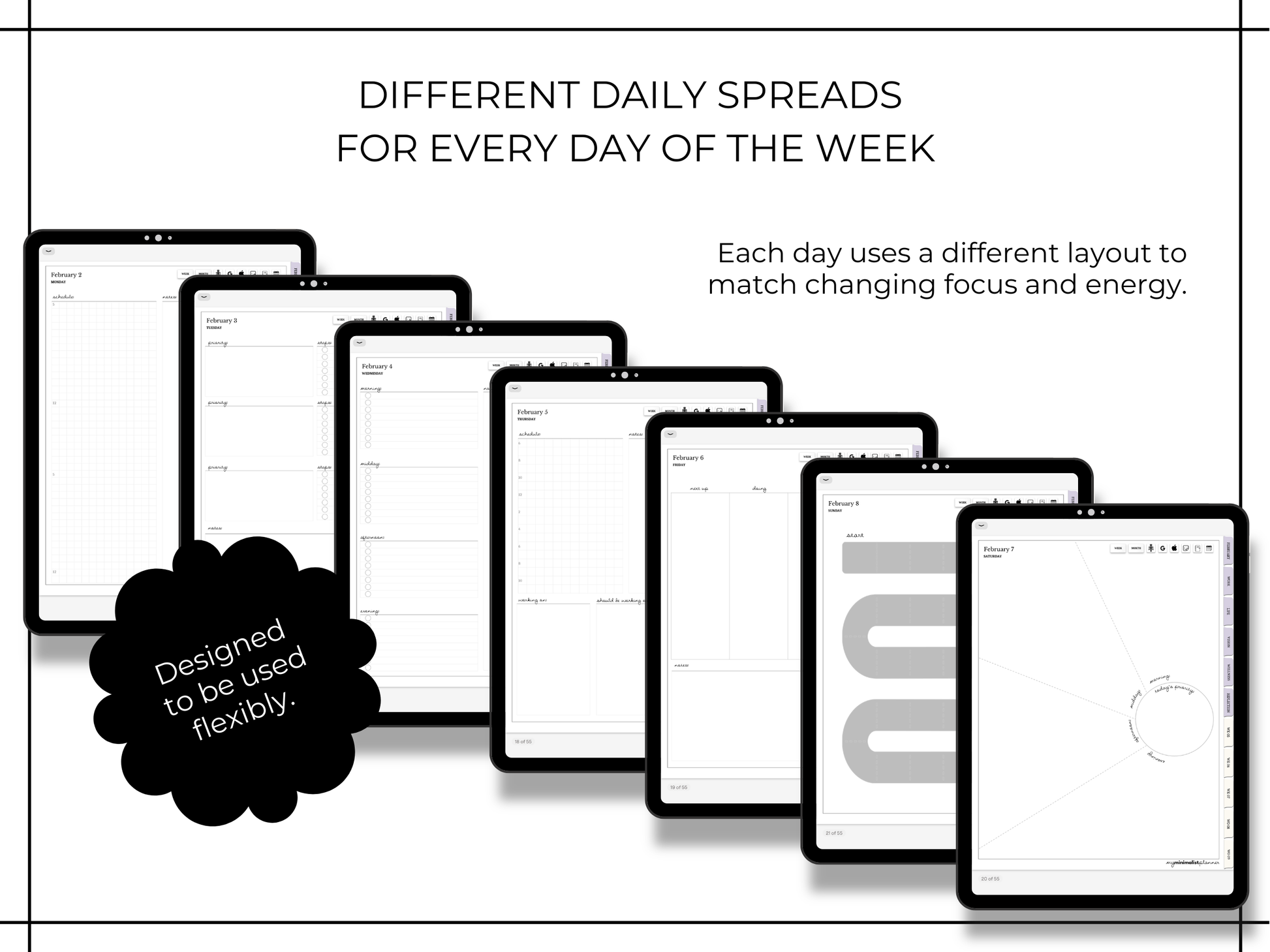 * One full month of daily pages, with a different layout for each day of the week