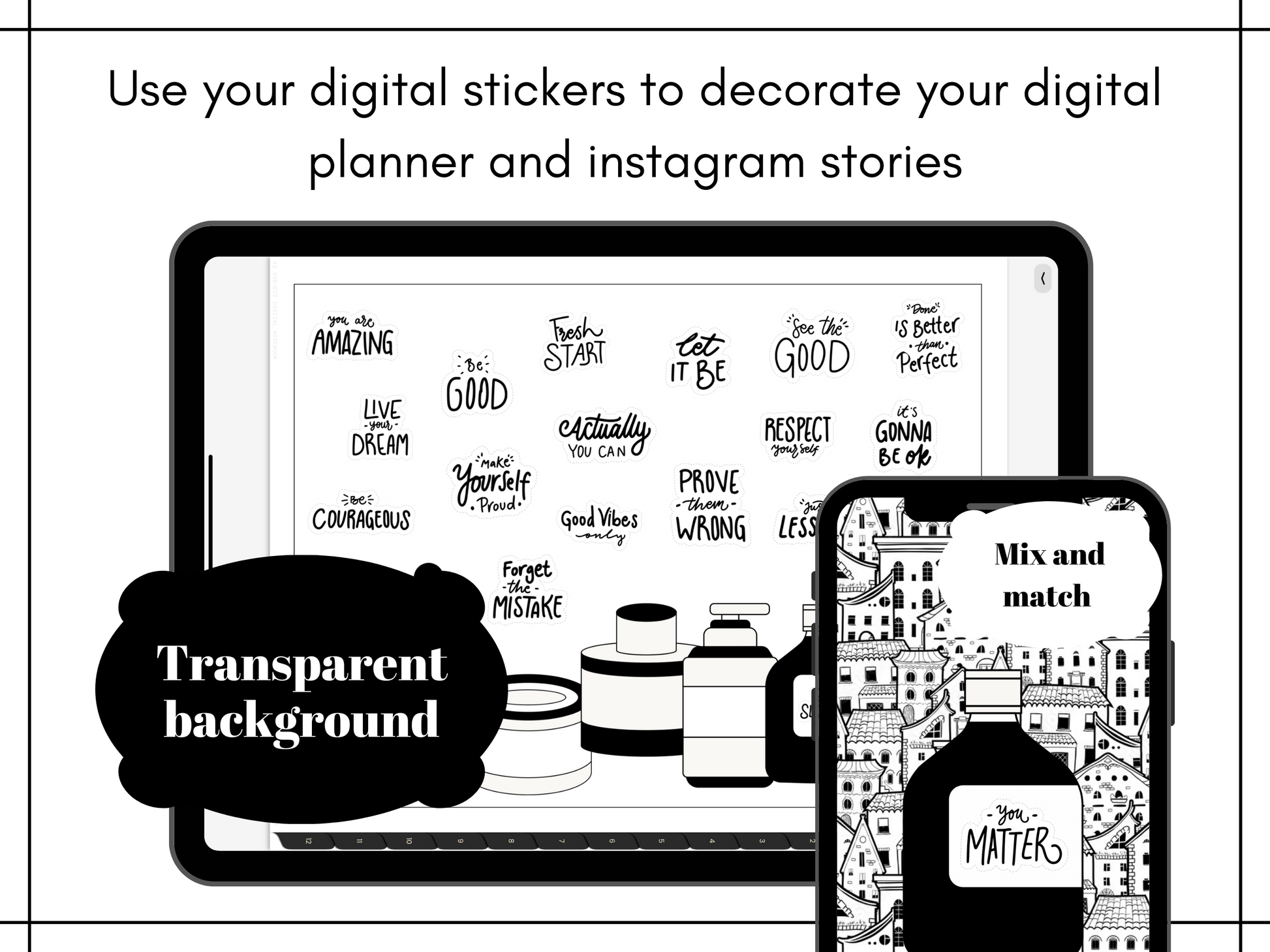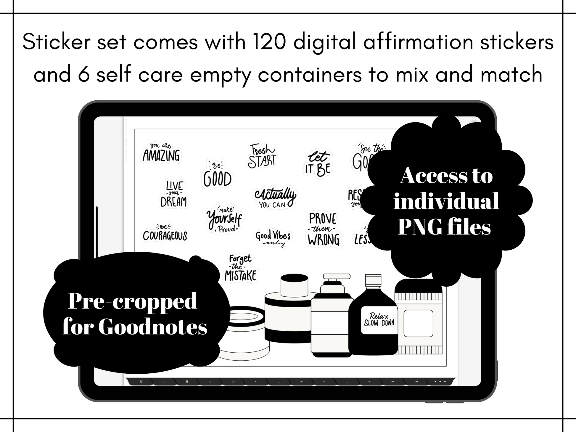 The digital sticker set comes with 120 affirmations and 6 empty self-care containers to customize your stickers. Download the Goodnotes digital sticker book for ready-to-use pre-cropped Goodnotes stickers. Access all individual PNG planner clipart to use with other digital planning apps.