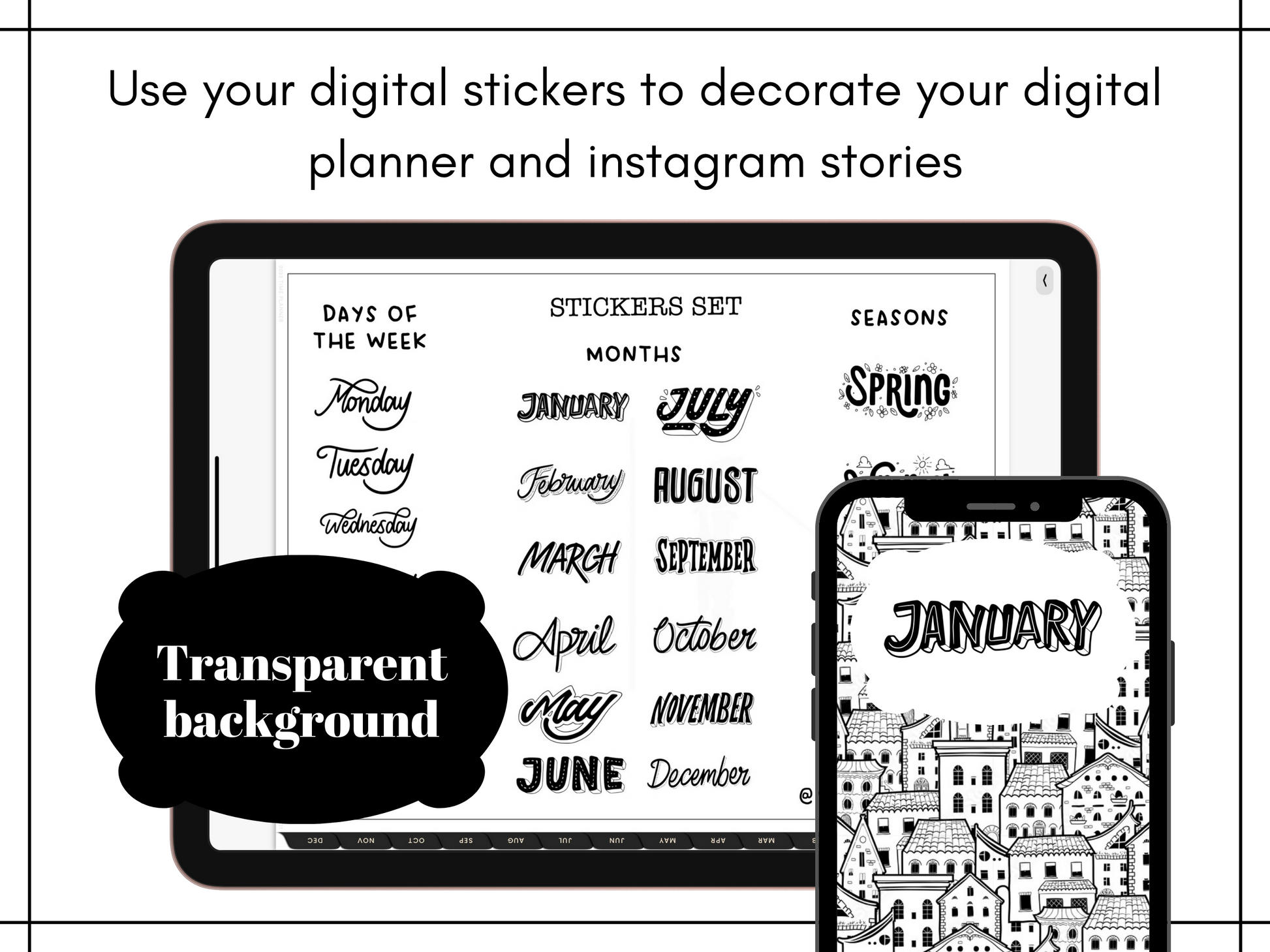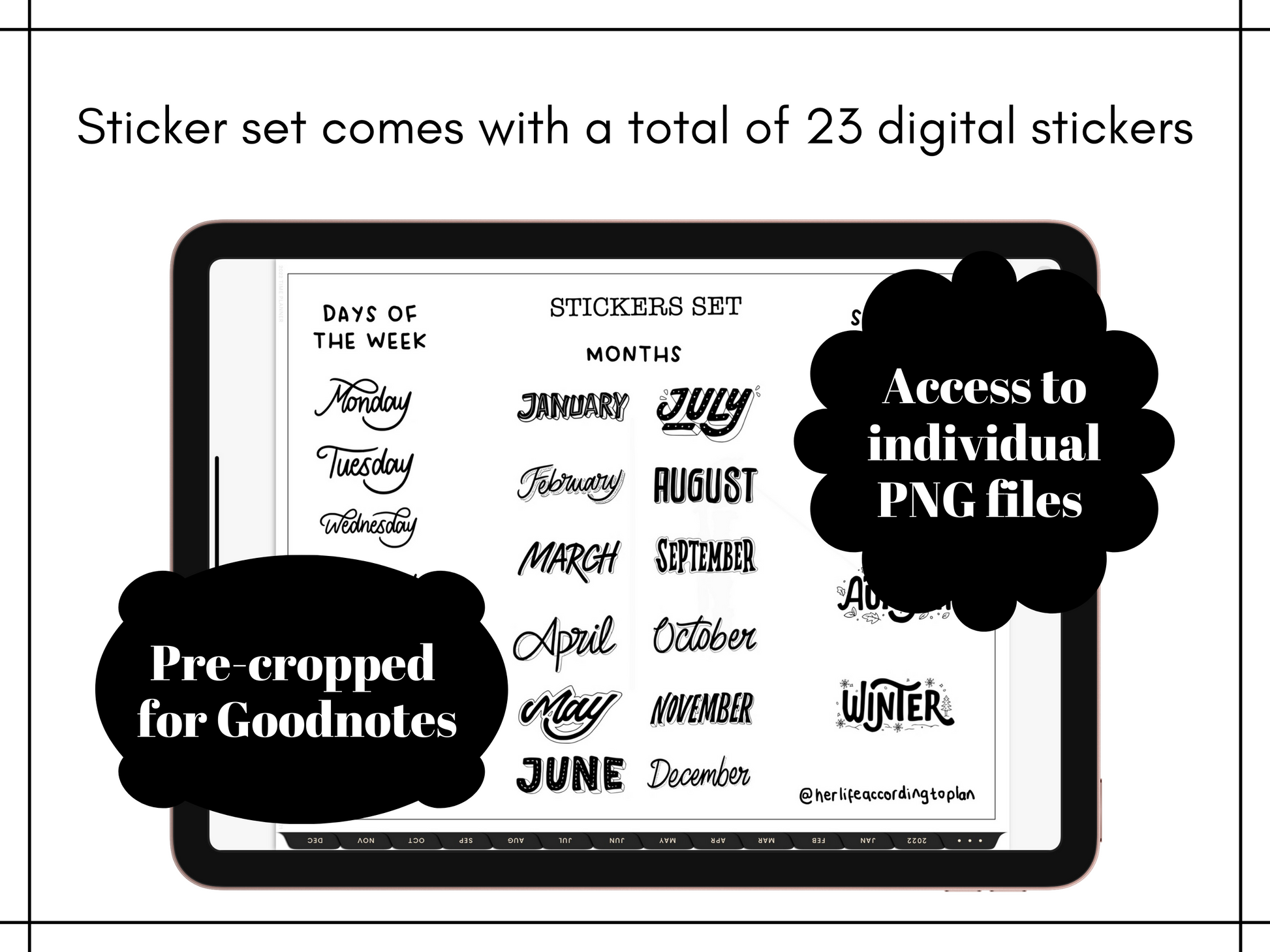 This minimalist digital planner sticker pack is for your everyday use. Labels for days of the week, months, and seasons are perfect to decorate and customize your digital planner or bullet journal using the Goodnotes app.