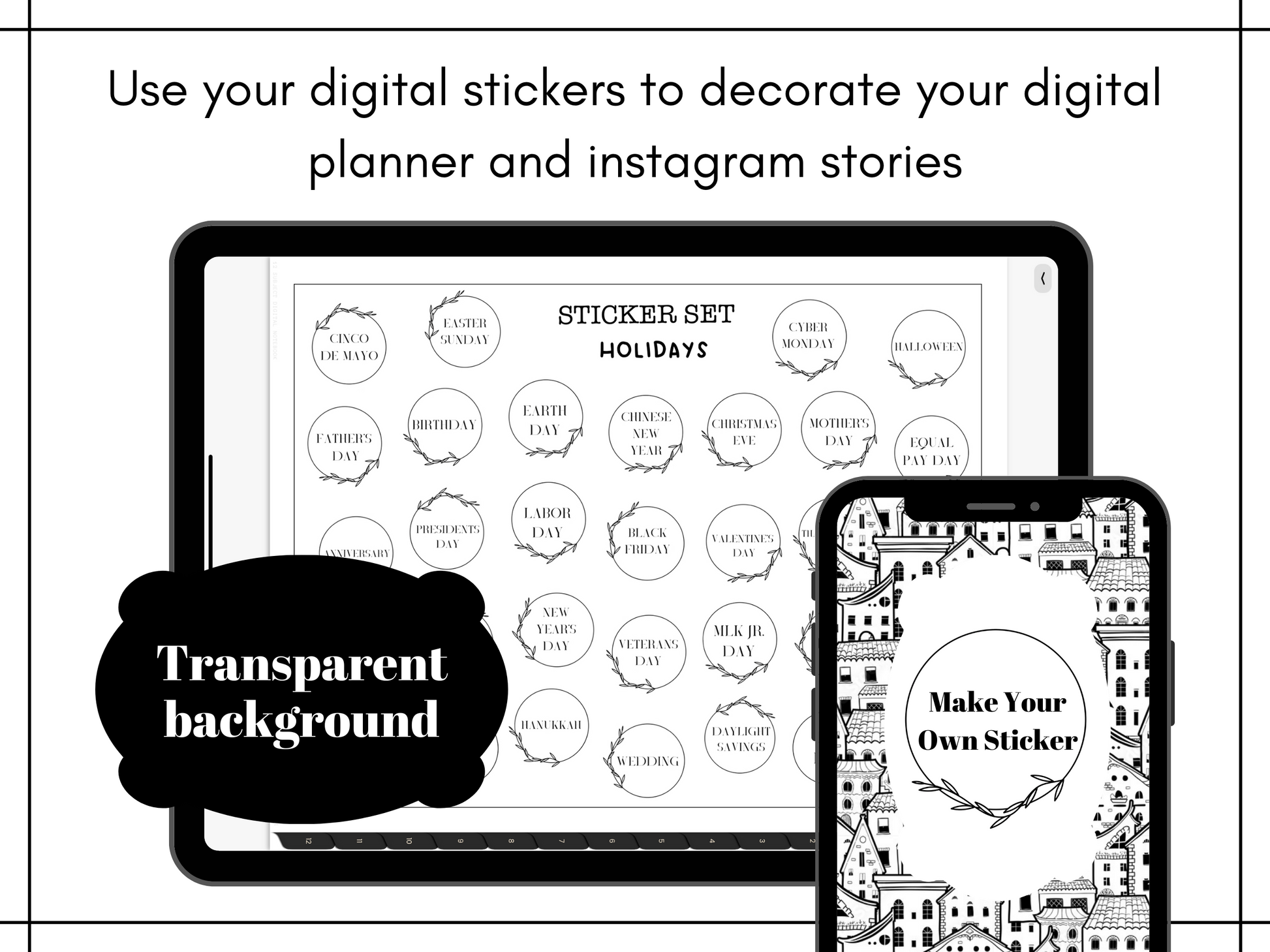 The digital sticker set comes with 30 illustrations. Download the Goodnotes digital sticker book for ready-to-use pre-cropped Goodnotes stickers. Access all individual PNG planner clipart to use with other digital planning apps.