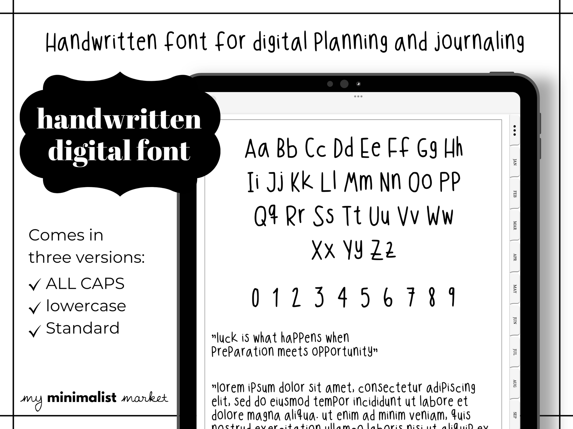 Introducing My Minimalist Market's Digital Font - a minimalist handwritten font that feels and looks real, as if you were using real pen and paper. Use this font to elevate your digital planning journey. This font is perfect for digital planners and digital notebooks and comes in three styles (ALL CAPS, lowecase, Standard and Cursive).
